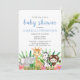 En söt inbjudan till babydusch innehåller vattenfärgsillustrationer av djungelsafari-djur med gröna accenter Anpassa alla detaljer om nyckel, inklusive föräldrarna namn, datum, tid, plats, OSA och registerinformation i modern blå och grått-typografi Den omvända sidan samordnas i blått
