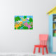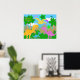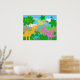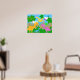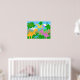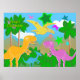 Jungle Dinosaurs Färg Poster. Dinosaurier i tecknad: orange och rosa T-Rex, blå parasaurolophus och gult som flyger Pteranodon i ett förhistoriskt djungellandskap med handflatan träd och berg med färg-stjärnor poster tryck. Den här dinosaurien poster utskrift är helt anpassade, lägg till dina texter och bilder. En underbar färgstark barn poster gåva till den lilla stora dino fläkt!