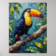 Den här bilden visar en tukan som en lysande "djungeljuvel", som fångas i ett dynamiskt, uttrycksfullt stil. Målningen kännetecknas av sitt tunga struktur och synliga penselarbete, som gör att den kaninske färgen lever. Fågans stora, färgstarka slag och ljusa fjädrar från gulten är brännpunkten mot en bakgrund av lush, abstraktens löv i blues och gröntar.