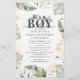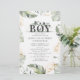 Vild, lugn och elegant pojkar, safari-djungelduschinbjudan med giraffe, guld-effekt och grönt löv. Perfekt för inbjudningar till babyduschbudget