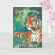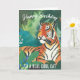 Digitalt illustrerad konsttryck av en ljus orange tiger i en frodig grön djungel-miljö. Design av Shelby Allison.