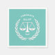 Kreativa servetter för juristexamen fest med rolig rättvisans våg-illustration och gratulationer till din nya jurist. Anpassa texten genom att lägga till namn och andra detaljer.