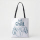 A cute, playful doodle like illustration of a snowman surrounded by tree and a text, that says "Just Chill".
