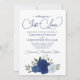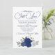 Denna vackra inbjudan till bröllopsinbjudan till boho-chicen innehåller ett kluster av handmålat vattenfärg ro i skuggor av dammig blått, marin och indigo, tillsammans med eukalyptus lövs trädgårdsgrey. Rubriken är skriven i finare, skript och lyder: Ingenting Finare, Just Kärlek! På baksidan finns ett detaljavsnitt med anpassadet QR-kod där du kan dirigera gästerna till en webben för mer information och/eller OSA. Den har en bukett av samma blommor med en blomande platinabb, på en marmorerad stålblå bakgrund.