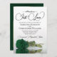 This beautiful wedding invitation features a single romantic long-stemmed emerald green colored rose lying on its side reflecting in a pool of water. The heading is written in fancy script lettering with swashes or flourishes and reads: Nothing Fancy, Just Love. The back has space for your photo inside of a deep emerald green border. This invite is the perfect combination of modern and timeless - it's both classy and whimsical making it perfect for either a formal or casual ceremony.