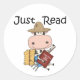 Läs bara T-shirts, hookar, mugg, kort, klisterlappar, knappar, magneter, muspekare, journal, keepsakes och andra lästematyrkläder och presenter som främjar läsning på ett sött sätt! En ko med en halmhatt och en högaffel vilar mot en höbale med bok!