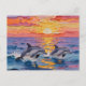 A pretty postcard with two dolphins swimming across the ocean waves at sunset done with ai in an impasto oil or acrylic style.