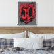 Den här JL-logotypen är målad i ljusröd, accentuerad med svarta och röda penseldrag bakom den.