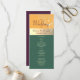 Elegant, modernt bröllopsprogram i juvelton med smaragdgrönt, gult och plommonlila, med förgylld blomsterlace och enkel kalligrafi.
