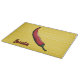 En röd jwala chili-peppar, även känd som en indiansk peppar i hett finger, är dekorerad med mönster inspirerad av indiskt medium och sitter på gultens bakgrund med en mindre version av samma mönster och en skriptetikett i hörnet. Denna måttligt kryddade peppar används för att tillsätta värme till autentiska kurvor och annat indiskt cuisine.