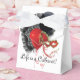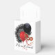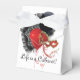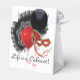 Vit tält-stil med vit ruta för menyfliksområdet med en skåbild, framtill och baktill, av en svart luddig fläkt, röd och svart ballong och en röd mask. Valfri text. Vi föreslår att man ändrar det vita bandet till rött eller svart satin för att få ett mer kompletterande utseende. Se matchningsinbjudan, konetti, förmånspåse, förmånstagg, presentpåsar, rund dekal, vinyldekal med anpassningsbar och papper förpackning. Visa hela samlingen för Cancan Favor Box i SPECIELLA TUUCHES | Avsnittet Party favors.