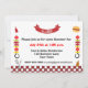 En grillinbjudan med en gräns av röd och vit gingham på vitt. Två skevade kabobs, utensiler och maträtter dekorerar sidorna överst är en röd banderoll med text som meddelar BBQ party.
