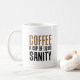 Kaffe - en Kopp av flytande sanitet, lustigt. En underbar mugg för någon som behöver kaffe för behållans förnuft! Oavsett om du blir galen hemma med barn eller på jobbet kan du räkna med en kopp kaffe för att hjälpa till att behålla din sundhet! En underbar gåva till ett kaffe älskare.