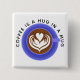 Blåkaffe kopp med skumhjärtat ord "Kaffe är en kram i mugg".