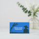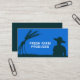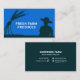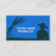 Ett affärskort på en blå bakgrund med en illustration av en jordbrukares silhuett och ett vete. Fullt kontaktinformation finns på baksidan och är dekorerad med ikoner.