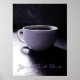 Fotografi av ett ångande kopp av nybryggt kaffe. Bilden har en blåaktig, moody färg och filmnosbelysning. Lika perfekt för att skicka till koffeinhound eller dem som använder sig av högljudda java en regnig dag.