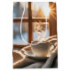 Kopp av ångkaffe på en varm filt vid ett vinterfönster med solsken.