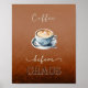 Latte eller cappuccino, med latte konst i form av ett hjärta. Bakgrunden är ett varmt brunt färg med ett texturerat utseende. I texten på poster står det "kaffe före CHAOS" med "kaffe" Den totala estetisken är rustik och mysigt, vilket tyder på att kopp kaffe är viktigt för att klara det kaos som råder under dagen. Det är inbjudan som vill pausa, njuta av ögonblicket och njuta av den lugn som följer med ett ångande kopp av java.