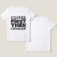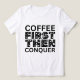Kickstarta din dag med den här djärva men enkla T-shirt-designen som talar till varje kaffe älskare! Med ren, sans-serif-typografi och en elegant monokrom palett är "Kaffe först, sedan konquer" T-shirt perfekt för dem som tror på att börja sin dag med koffein och självförtroende. Underbar för: Kaffeentusiaster och koffeinberoende. Kontor, avslappnad eller bära hemifrån. Att ge efter födelsedagar, helgdagar eller "bara för" ögonblick.