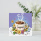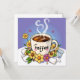 En söt kopp av varmt kaffe omgiven av gult och lila blommor, sockerbitar och gräddpaket. Kortets baksida är tom så att du kan skriva en anteckning till en vän.