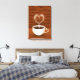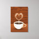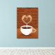 En Kopp i kaffeillustration med en vit mugg hett kaffe med hjärtformade rök på brunt underlag med typografi på väggen.