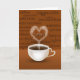 En Kopp i kaffeillustration med en vit mugg hett kaffe med hjärtformade rök på brunt underlag med typografi på väggen.