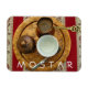 Ett foto av ett bosniskt kaffepaket i staden Mostar i Bosnien och Hercegovina som är tryckt på en kylmagnet i souvenir.