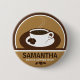 © Sunny Mars Design. Brun- och Beige Coffee Kopp Cafe Staff Identity Märkre Round Pinback Button - Coola cafe-personal, servitör- eller waitress namn bricka badge med ett modernt, trendig, snyggt, söt, stiliserad illustrationsikondesign av en ångande mugg eller kopp av kaffe och såser. Anpassa den genom att lägga till din egen text till den. Perfekt namn bricka för anställda vid kaffebutiker.