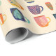 En mängd färgkaffe och te kopp med olika blommigt och mönster i hjärtat arrangeras i ett upprepande mönster mot en vit bakgrund. Varje kopp visar en unik kombination av färg och formgivning som skapar en dynamisk och symmetrisk visning.