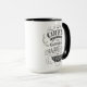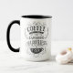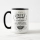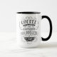 Mugg har en vismisk handskrift som säger: "Kaffe med en vän är som att fånga lycka i ett kopp" på en vit bakgrund. I bokstäverna finns dekorativa svasser och prydnadssnurrar. Utformningen upprepas på baksidan.