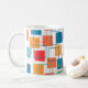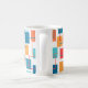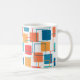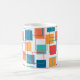 Mugg har en geometrisk design av kvadrater i tangeriner, vallmo, korall och tårtnyanser som är spridda över konturerna.