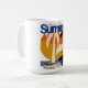 Ett kaffe mugg med en vacker sommarillustration: strand, surfa, båt, sköldpadda, handflatan träd och sol