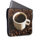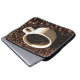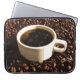 I laptop sleeve visningar en vit demitasse kopp av ångande nybrenade kaffebönor på en bädd av mörk bruna rostat kaffebönor.