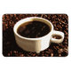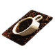 Den här magneten visningar en vit demitasse kopp av ångande nybryggat kaffe som läggs på en bädd av mörk bruna rostat kaffebönor.