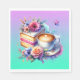 En söt i vattenfärgen stil biet av födelsedagskalas med rosa och lila blommor och ro bredvid kopp av kaffe eller uttrycksvis söt blommigt födelserumlackor. Bakgrund för lila och kalk.
