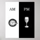 Delad i två lika stora delar för morgon och kväll. Vitt på morgonen med svarta illustrationer och skript på anpassningsbarna och svart på kvällssidan med vita illustrationer och skript på anpassningsbarna.