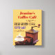 För kaffet älskare kommer det här roligt 8"X10"-kanvastrycket att se underbart ut i ditt kök, frukost eller i hemmet kaffe pub. Min originalgrafik har en vintage kaffebönor med en färsk korv kopp av kaffe. Rubriktexten "Jeanine's Café" kan anpassas med vilken namn som helst och färg.
