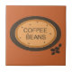 En coola med en skylt med kaffebönor i bränd orange och chokladbrun. Några utspridda kaffebönor bredvid den. En bränd ornage-bakgrund släcker den.