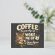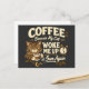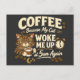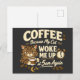 Söt vykort idealisk för kaffefanatiker och kattälskare med en grinig katt som håller en morgonkopp kaffe. I rolig text står orden "Kaffee, för att min katt väckte mig kl 5 igen". Andra bilder runt designen är en väckarklocka inställd på 5, kaffebönor och en liten måne och sömniga Z-tecken.