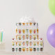 En variation av färgglada kaffe- och tekoppar med olika blommiga och hjärtmönster är arrangerade i ett upprepande mönster mot en vit bakgrund. Varje kopp visar en unik kombination av färger och mönster, vilket skapar en livfull och symmetrisk display.