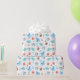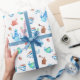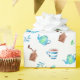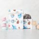 Sött kaffemönster med koppar kaffe, tekannor, kaffemuggar, kaffekvarnar, kaffebönor och teblad. Dessa är i akvarellnyanser av brunt, blå/vita ränder, blått och turkos.