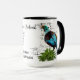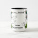 En kaffemugg med en karta över Nordön, Nya Zeeland, Kowhai-blommor (infödd växt), en ormbunke och en tui (infödd fågel)