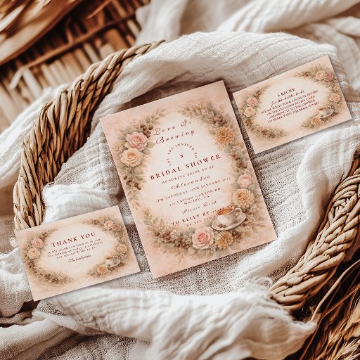 Varm, romantisk och otroligt mysig, denna kaffet inspirerade bröllopsfest-design har rosa rosor, espressobönor och en charmig cappuccino-detalj i lager ovanpå en mjukt åldrad pergamentbakgrund. De rika karamell- och chokladtonerna skapar en välkomnande kaféatmosfär, perfekt för höstfiranden eller brunches. Elegant typografi balanserar det rustika och varma, vilket gör den idealisk för kaffeförälskare och brudar som älskar intima, mysiga detaljer. Ett vackert val för en höstbröllopsfirande fylld med kärlek och lattar.