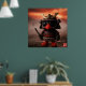 Kagumusha Den här bilden har en charmerande, stiliserad Yanbaru Kuna figur, som påminner om en underbar film av Akira Kurosawa, skild som samurai. Tecknet har en mörk, möjligen svart eller mycket mörk brun, kropp med en framträdande röd topp och stort, runt, svart ögon, ge det ett ädelt men bestämt uttryck. Den är klädd i miniatyr samurai armor, främst mörk med intrikat rött mönster och accenter. Ett rött snedstreck eller obi syns runt midjan, och det bär röda stövlar. På huvudet finns en liten, detaljerad samurahjälm, mörk med hornliknande prydnadsföremål av guld-färgad. I högernas hand griper den ett litet svärd av mörk. Bakgrunden är mjuk, men antyder ett dramatiskt, varmtonat himmel, möjligen en solnedgång eller soluppgång, med bergsledtrådar eller ett slagfält, som kompletterar samma tema. Det övergripande intrycket är ett av ett sött, överväldigande krigare redo för handling.