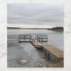 En vin flaska-etikett med ett foto av en fryst docka på ett fryst sjö.