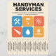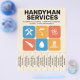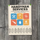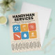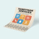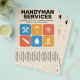 En professionell flyer för hantverkarservice med avrivbara flikar och en färgrik layout med fet blå och orange färgskala. I mitten visas en samling ikoner inklusive en skiftnyckel, hammare, målarpensel, handsåg, vattendroppe och ett hus. Helt anpassningsbar, den kan vara lämplig för alla typer av reparationsaktiviteter såsom hantverkare, reparationstjänster för hemmet, renovering, VVS, gipstak, målning, snickeri, etc.