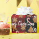 Kakor och polkagrisar på svarta och röda bufflar med God jul-text. Bakgrunden kan ändras. Text kan redigeras.