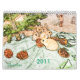 Original- konstverk av kaniner runt om det rabbitry dekorerar varje sida av denna färgrika kalender 2011.