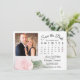 Det här vackra bröllop spara datum-kortet har en tidlös klassisk utformning med en enda rosa färgad ro i blek med lång härd. Det finns en anpassade-kalender där du kan placera ett hjärta runt ditt bröllop-datum med plats för ditt foto, parets namn & bröllop. Elegant, romantik och snyggt, det här kortet är ett enkelt och praktiskt sätt att låta dina vänner och familj veta att spara datumet för din speciella dag.