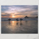 Iconic Huntington Beach "Surfa City"-fotografi har trio av ytakter som är silhuetterade mot hav, pier och solnedgång. Perfektens bakgrund för semesterfoton och -arrangemang